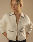 This polo cardigan showcases contrast stitching, a collared neckline, novelty buttons, and front pockets, crafted in a medium-weight knit that balances softness with subtle natural texture.