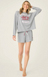 Easygoing comfort with a playful nod to the West. This heather grey short pajama set features a vintage-style horse graphic and “hold your horses” lettering, paired with relaxed drawstring shorts for warm-weather lounging.