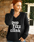 Let's toast to this buttery soft and oh-so-cozy lightweight V-neck. Perfect for transitioning between seasons, it features the words "Pop Fizz Clink" knit directly into the center front. Details include ribbed finishes at the neckline, cuffs, and hem.