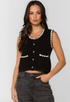 This cropped sweater vest features a contrast trim, novelty button closure, front pockets and is softly structured with a substantial feel and gentle stretch. Designed with and a close-yet-comfortable fit.