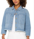 This versatile crop shacket features subtle stripes and a light wash, adding a fresh twist to a classic style. The striped pattern and fray hem creates a versatile piece that can be easily dressed up or down for any occasion.