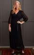 Wrap yourself in elegance with this V-neck maxi dress featuring solid plisse fabric, a single snap closure in front, a flowy skirt, three-quarter sleeves, a 54" length, a lined interior, and a removable fabric belt.