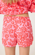 A pair of shorts designed for comfort and style features a bold floral print in shades of pink and coral. Made from 100% cotton double gauze, this lightweight fabric offers breathability for those warm days. An elasticized waistband with a drawstring provides a flexible fit, making these shorts easy to wear. Ideal for lounging, beach outings, or casual meet-ups, they can easily be paired with various tops for versatile styling. Side pockets add functionality, while the relaxed fit ensures ease of movement. Perfect for adding a playful touch to any summer wardrobe.