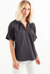 - Women's short sleeve blouse with elasticized ruffle collar and sleeve detail