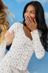 A fresh take on cozy layering. This ivory cardigan—crafted from brushed rib with a touch of stretch—features a romantic rose print and dainty lettuce-edge trim. Wear it open over the matching cami for an easy at-home set or buttoned up with trousers for a hint of vintage-inspired charm.